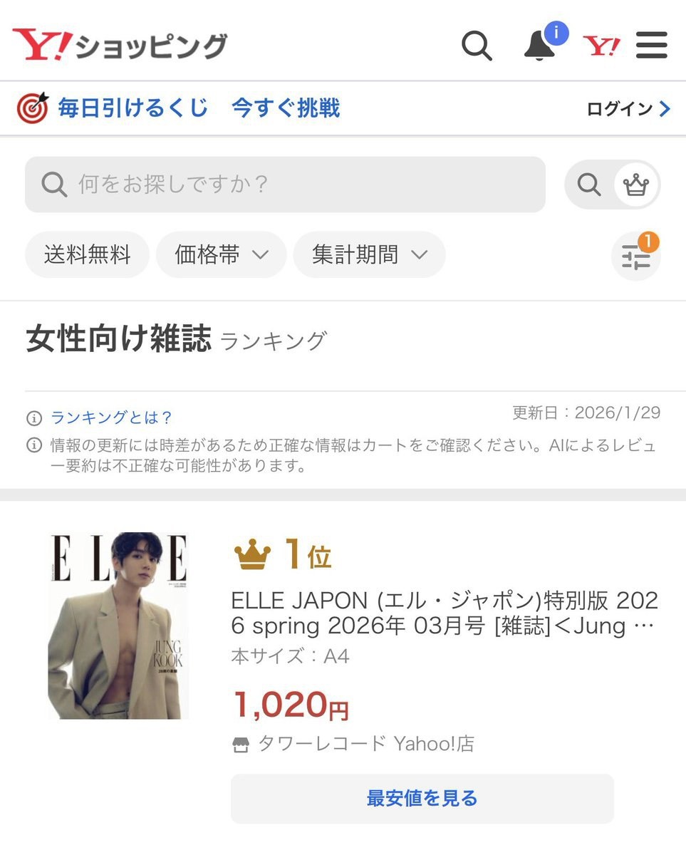 🍊 Специальный выпуск Elle Japan с Чонгуком (весна 2026) занимает первое место в рейтинге женских журналов на Yahoo Japan Shopping!