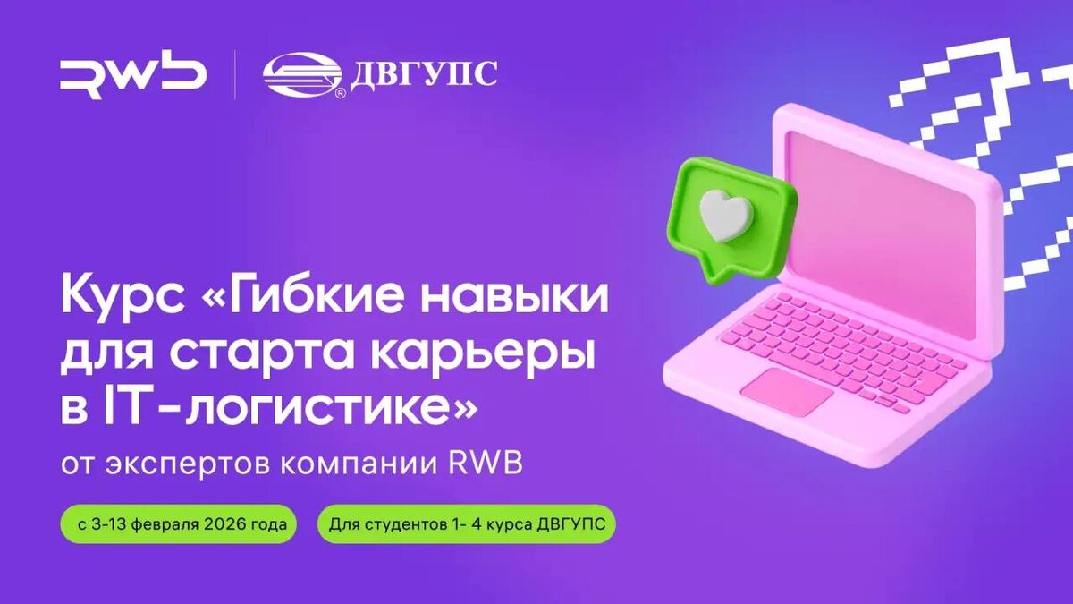 ! Курс «Гибкие навыки для старта карьеры в IT-логистике» от экспертов компании RWB 🔜 с 3 февраля по 13 февраля 2026 года Для студентов 1- 4 курса ДВГУПС Лекции: 03.02.2026 Эффективная коммуникация: Стили и стратегии поведения в конфликтных ситуациях 06.02.2026 Командная работа и роли в проекте 11.02.2026 Публичные выступления и самопрезентация 12.02.2026 Тайм-менеджмент и управление задачами 13.02.2026 Решение проблем и критическое мышление в условиях неопределенности Каждое занятие включает обратную связь от преподавателя-практика. Приходи, будет интересно. Все лекции в онлайн формате Регистрация по ссылке до 02.02.2026: https://forms.yandex.ru/u/697a979bf47e73e1ea544e8a