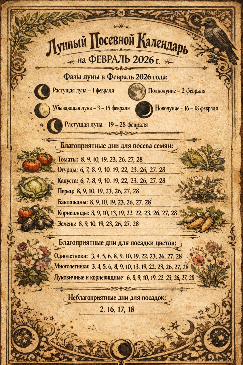 Лунный посевной календарь на ФЕВРАЛЬ 2026г. подскажет наиболее благоприятные для различных работ дни.
