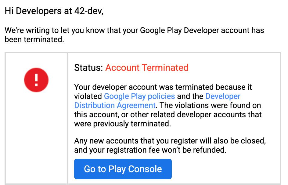 Пост для разработчиков, которые зачем-то публикуют приложения клиентов от собственных учетных записей. На прошлой неделе я увидел в почте письмо (см. скрин), в котором говорится, что наш аккаунт разработчика Google Play удален, все приложения сняты с публикации, любые новые аккаунты, которые мы попытаемся создать, будут автоматически закрыты, и деньги за них не будут возвращены, спасибопожалуйста, с уважением Google. Честно скажу, я немного... удивился, но быстро разобрался, в чем дело. Причина — нарушение Google Play Developer Distribution Agreement, а именно пункта про санкции и экспортный контроль. ⚡ для протокола: