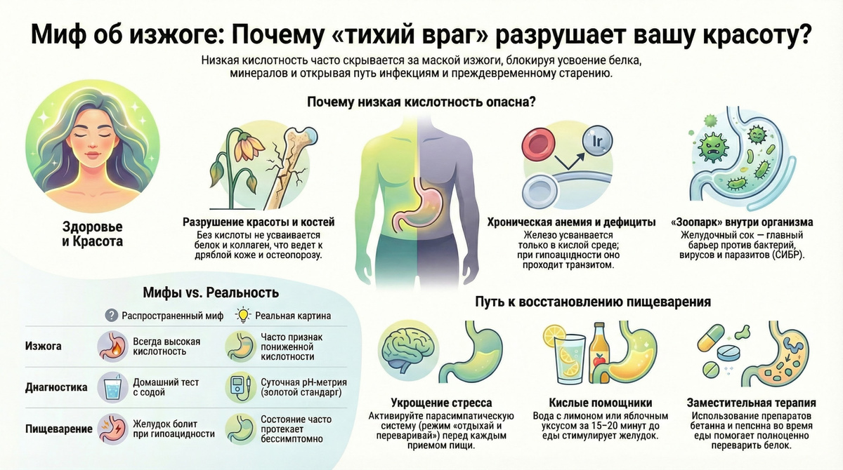 Миф об изжоге и «тихий враг» вашей красоты Многие ошибочно полагают, что изжога — верный признак повышенной кислотности, и начинают гасить ее препаратами. Однако чаще всего это сигнал пониженной кислотности, состояния, при котором желудок теряет способность нормально переваривать пищу. Соляная кислота необходима нам, как маринад для шашлыка: она размягчает сложные белковые структуры, подготавливая их к усвоению. Без достаточного количества кислоты страдает весь каскад пищеварения: желчный пузырь и поджелудочная железа не получают нужных сигналов, а перистальтика замедляется. Почему это опасно? Коварство низкой кислотности (гипоацидности) в том, что она «не болит», в отличие от гастрита с повышенной кислотностью. Но последствия разрушительны: 1. Удар по красоте: Без кислоты не усваивается белок, нарушается синтез коллагена. Итог — дряблая кожа, целлюлит, выпадение волос и ломкие ногти. 2. Разрушение костей: Кость состоит из белковой матрицы. Длительный дефицит кислоты повышает риск осте