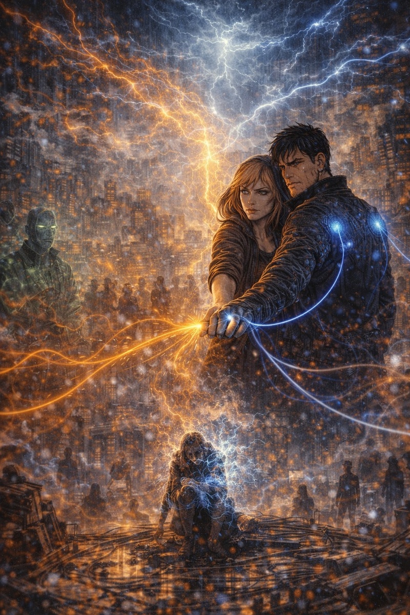 Все главы Небо над городом было раскрашено штормовыми молниями. Нижние сектора дрожали под тяжестью дождя, но это был не обычный дождь — это была энергия Нити Мира, вырвавшаяся из-под контроля. Аэлин и Каэл стояли на крыше разрушенной станции, держась за руки.