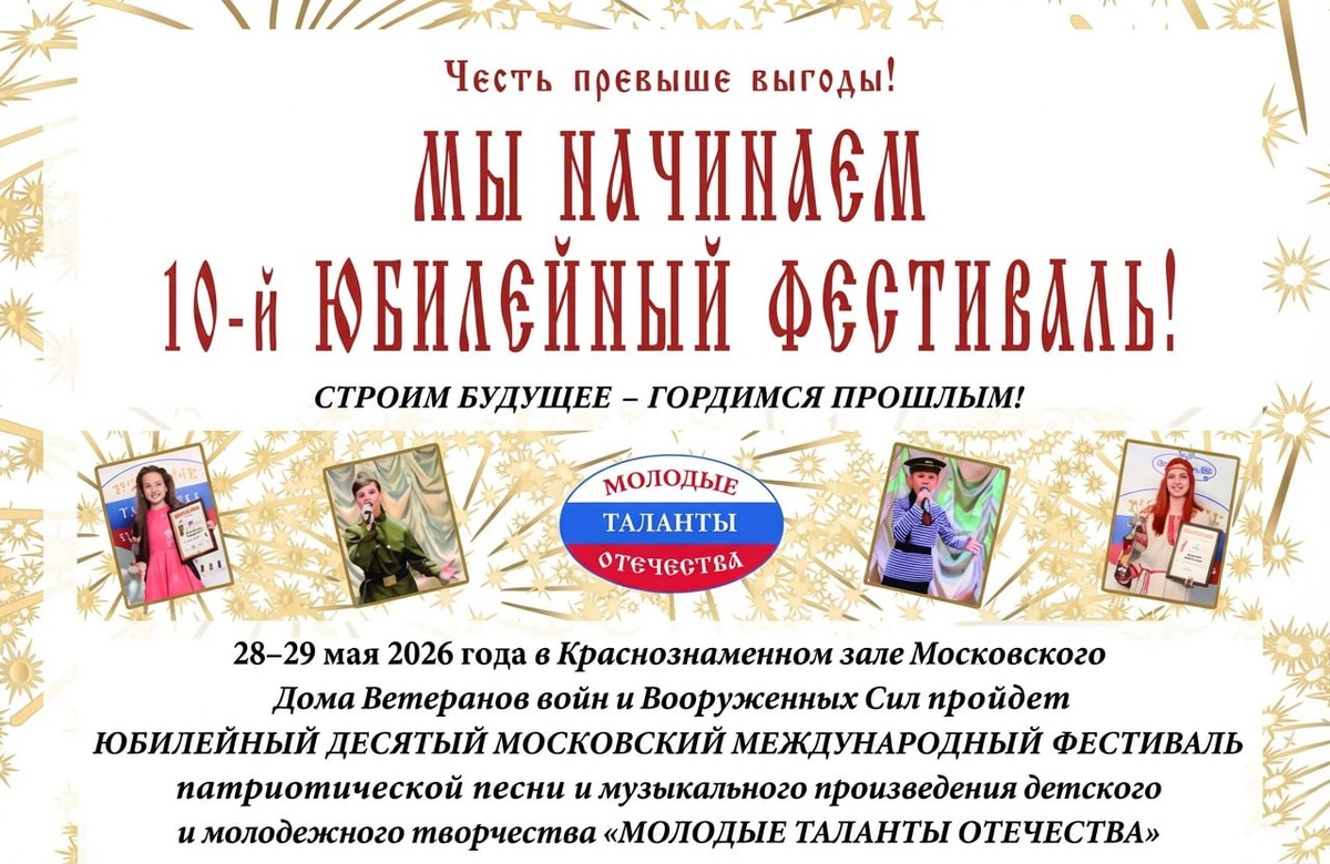 28 и 29 мая 2026 года столица России станет центром притяжения для одаренных детей и молодежи со всего мира. В эти дни пройдет десятый, юбилейный Московский международный фестиваль детской и молодежной музыки «Молодые таланты Отечества». Это событие не только подарит незабываемые впечатления юным музыкантам, но и будет приурочено к ряду значимых дат в истории нашей страны: Фестиваль призван стать мостом между поколениями, помочь детям