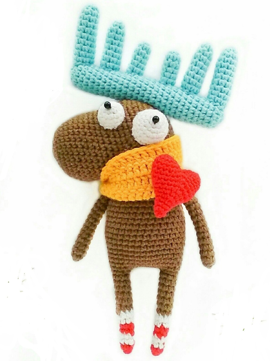 Ищете забавную идею для подарка своими руками? Вязаный крючком «Влюблённый Лось» — тёплый и смешной проект: большой нос, выразительные рога, полосатые носки, снуд и вязаное сердечко.