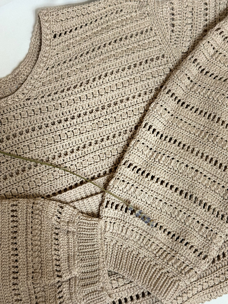 Горловину я провязывала чередованием рельефных столбиков, чтобы добиться имитации резинки.