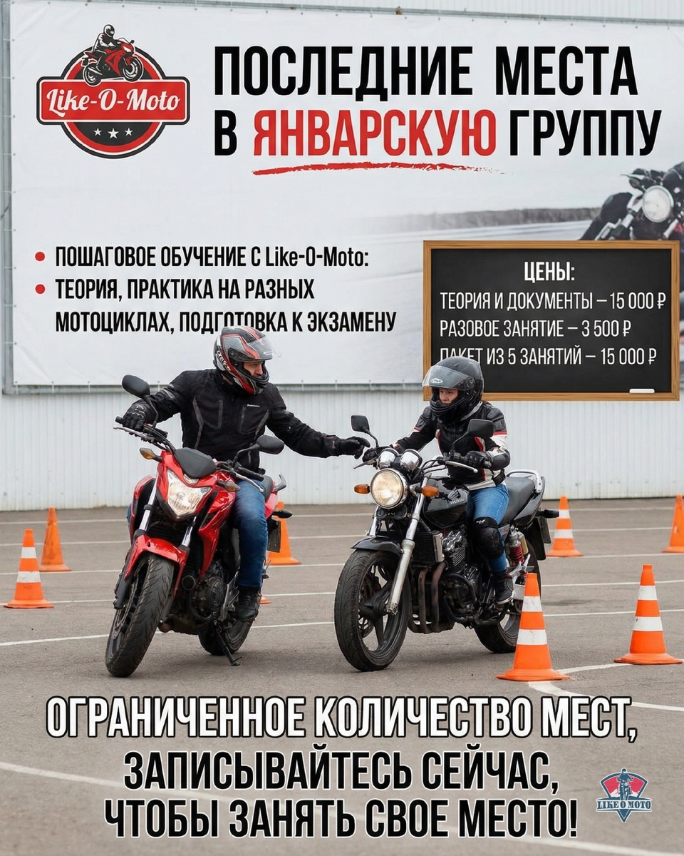 ⚡️ Группа на январь почти заполнена — следующий старт обучения будет только позже. Не упусти шанс начать уже в новом году и получить права как можно раньше! Мы поможем преодолеть страх и уверенно управлять байком с индивидуальным подходом. Обучение строится поэтапно — сначала теория, затем практика на различных мотоциклах, а в конце подготовка к экзаменам. Стоимость обучения: - Теория и оформление документов – 15 000 ₽ - Разовое занятие – 3 500 ₽ - Пакет из 5 занятий – 15 000 ₽ Записывайся сейчас, чтобы занять место и не ждать следующий набор. Количество мест ограничено — действуй быстро! Для записи → Записаться сейчас