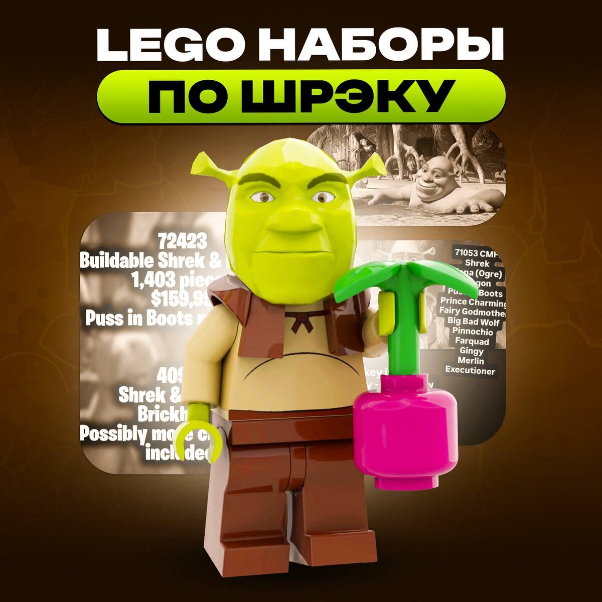 ! • 72421 (12+) • 72422 (12+) • 72423 «Сборные Шрек и Осёл» — 😍 1403, $120 (включает минифигурку Кота в сапогах) • 40923 «Шрек и Осёл» (Brickheadz) 🔤🔤🔤 Кроме того, той самой загадочной лицензионной серией CMF станет именно линейка по Шрэку. Список персонажей: • Шрэк • Фиона (в облачении огра) • Кот в сапогах • Лорд Фаркуад • Принц Чарминг • Фея-крёстная • Дракониха • Серый Волк • Пиноккио • Пряня • Мерлин • Палач Телониус 🔤 Также ожидается и уникальный осёл в виде аксессуара к одной из фигурок. Ждём ещё больше наборов по вселенной? 🙂 ❤️🔥 — конечно! 💀 — а я ждал сеты по Роблоксу... 🤔 Рари Брик