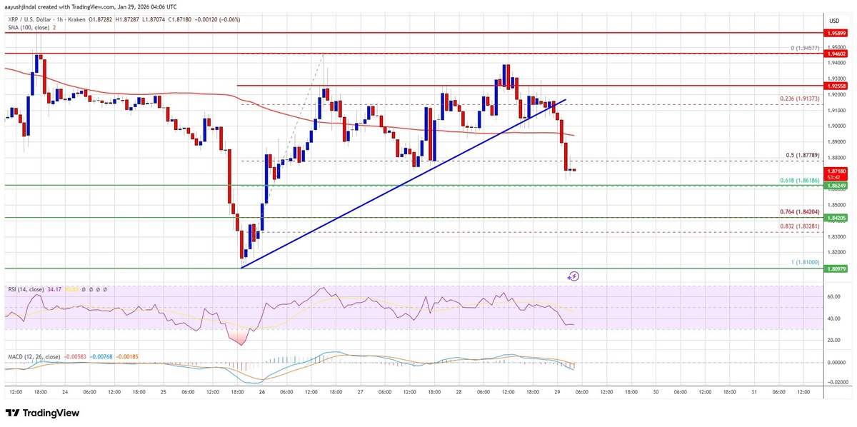 📈 Цена XRP не смогла преодолеть отметку в $1.950, что привело к новому снижению. Сейчас XRP корректирует рост и может испытывать трудности с удержанием выше $1.860. Цена торгуется ниже $1.890 и 100-часовой простой скользящей средней. 📊 Ключевые моменты: - Пробита ключевая бычья линия тренда с поддержкой на $1.910. - Падение ниже уровней $1.90 и $1.880. - Пробитие 50% уровня коррекции Фибоначчи от минимума в $1.810 до максимума в $1.945. - Основные уровни сопротивления: $1.90, $1.9250, $1.950, $2.00, $2.050. - Основные уровни поддержки: $1.860, $1.8420, $1.820, $1.80, $1.7650. - Часовой MACD находится в медвежьей зоне. - Часовой RSI ниже уровня 50. ⚠️ Риски: Если XRP не сможет преодолеть зону сопротивления $1.9250, возможно дальнейшее снижение.