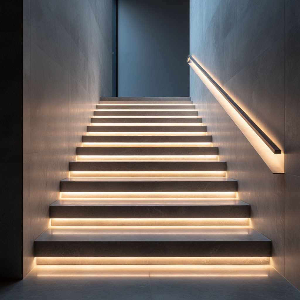 Лестницы являются не только функциональным элементом интерьера, но и важной частью его дизайна. Использование керамогранита для облицовки лестниц не только придаёт им эстетичный вид, но и обеспечивает долговечность и надёжность. В этой статье мы рассмотрим, как можно использовать подсветку для улучшения внешнего вида лестниц из керамогранита. Керамогранит — это прочный и износостойкий материал, который прекрасно подходит для облицовки лестниц. Он устойчив к механическим повреждениям, влаге и температурным перепадам, что делает его идеальным выбором для помещений с высокой проходимостью. Кроме того, керамогранит предлагает широкий выбор цветов и текстур, что позволяет подобрать оптимальный вариант для любого интерьера. Подсветка лестниц может быть выполнена различными способами: 1. Встроенная подсветка. Светодиодные ленты или другие источники света встраиваются в ступени или поручни. Это позволяет создать равномерное и мягкое освещение лестницы. 2. Точечные светильники. Точечные светил