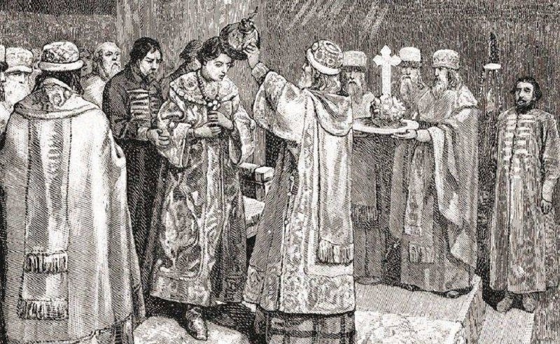 За месяц до сего события Иоанн, которому тогда шел семнадцатый год, призвал митрополита Макария и бояр и объявил, что хочет жениться, а перед женитьбой «по примеру наших прародителей и сродника нашего Великого князя Владимира Всеволодовича Мономаха, который был венчан на царство, также исполнить тот чин венчания на царство и сесть на великое княжение». Он попросил на это благословение у митрополита. 16 января в Успенском соборе Московского Кремля состоялось торжественное венчание на царство Великого князя Иоанна IV. Он прибыл в собор в сопровождении всех вельмож, приложился к иконам, отслушал молебен, затем взошел на амвон в центре храма и сел на специально приготовленный трон. Рядом с ним расположился митрополит. Затем владыка возложил на Иоанна Васильевича знаки царского достоинства: крест Животворящего Древа, бармы и шапку Мономаха, громогласно произнося слова молитвы, чтобы Господь оградил его силой Святаго Духа, посадил его на престол добродетели, даровал ему ужас для строптивых и
