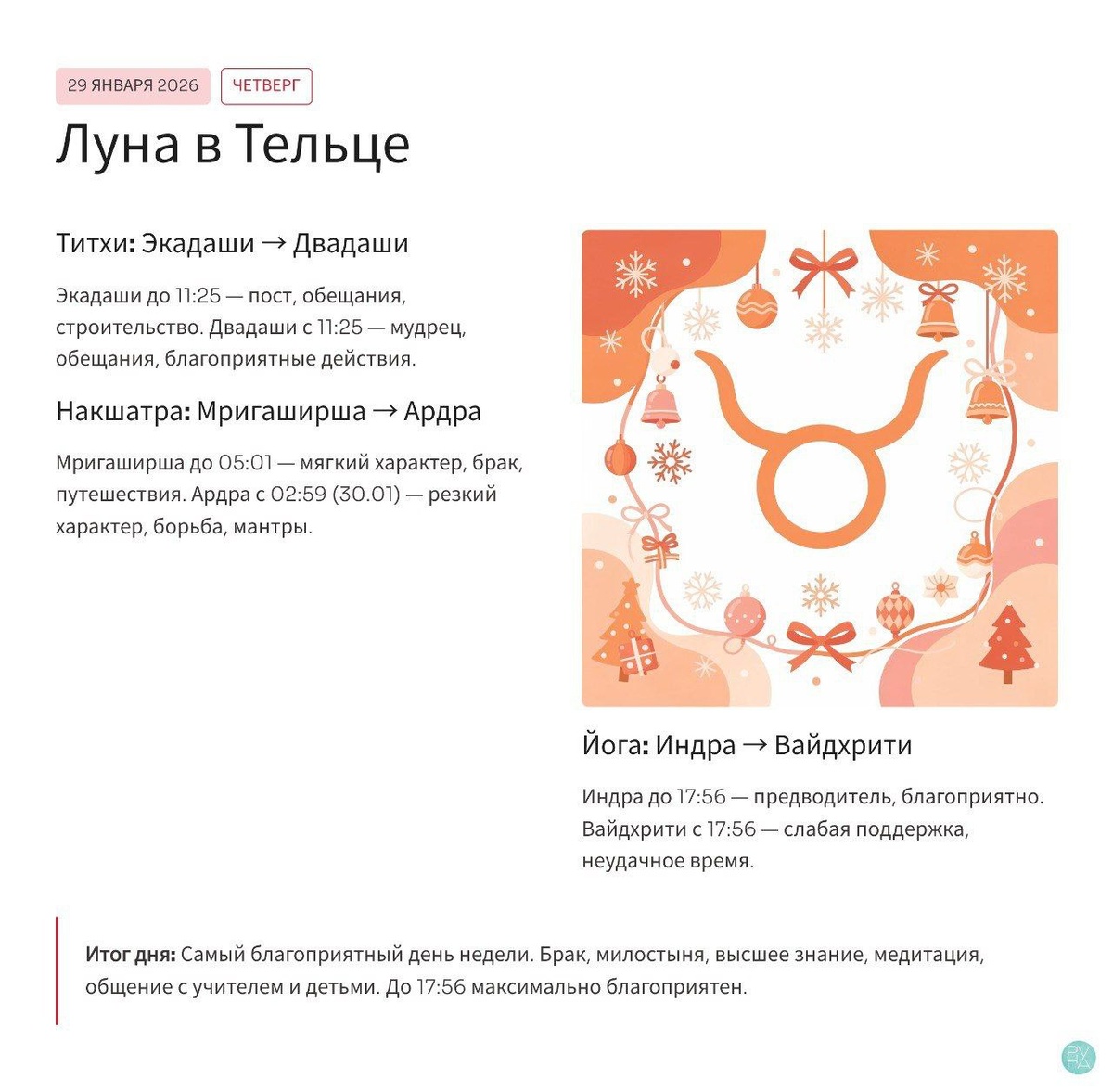 Четверг. День Юпитера. И это не просто день недели. Это духовный портал. Энергия Юпитера - мудрая, расширяющая, прощающая. Он приходит, чтобы очистить карму и указать путь. ГЛАВНЫЕ ЭНЕРГИИ ДНЯ 🪐 Юпитер ретроградный в Близнецах Великий Учитель движется вспять. Он приглашает пересмотреть старые знания, договорённости, убеждения. Не время для новой информации - время для глубинного понимания уже известного. Спросите себя: «Какое старое убеждение мне пора переосмыслить?» 🌙 Луна: от устойчивости - к общению ⚫️ До 16:01 - Луна в Тельце, в накшатре Мригашира. Энергия устойчивая, чувственная, направленная на поиск. Идеально для планирования, заземлённых действий, работы с телом. ⚫️ После 16:01 - Луна переходит в Близнецы и соединяется с Юпитером. Ум становится острее, общение - продуктивнее. Включается логика, связи, коммуникация. Но концентрация может рассеиваться - будьте внимательны. 🧘♀️ ДУХОВНЫЙ СТЕРЖЕНЬ: ДВОЙНОЙ ПОСТ Сегодня - особый день очищения кармы. 1. Экадаши, выпавший на