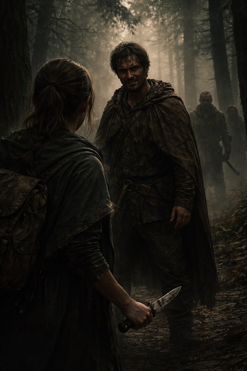 Когда между нами осталось десять шагов, я разглядела лицо. Мужское. Неровная борода, впалые щёки. Глаза смотрели не на меня, а сквозь, будто он видел что-то позади, в чаще. Он был не стар. Просто стёртый, как монета, долго ходившая по рукам. — Стой, — сказал он негромко. Я замерла. Рука сама потянулась к ножу за поясом. Он остановился в трёх шагах. Не приближался. Стоял тяжело дыша, будто поднялся в гору. — Идёшь от старого ворчуна? От того, что в сторожке? — спросил он. Я кивнула. — Он… дал тебе что-то? Книгу? Бумаги? — Нет, — ответила я слишком быстро. Мешок за спиной вдруг показался тяжелее. Карта. Еда. Вода. Ничего такого. Путник качнул головой, будто что-то обдумывая. Потом медленно указал назад, туда, откуда я пришла. — Не ходи туда больше. Там… нечисто. Он думает, что держит её на цепи. Но цепи ржавеют. Он снова посмотрел на меня. — Тебе к людям, да? К поселению? — Да. — Тропа впереди раздваивается. Правой стороны не бери. Там болото... Бери левую тропу. Она длиннее, н