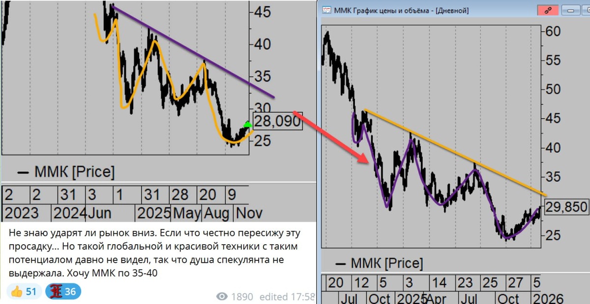 Хотя то что на таком росте сырья рынок всё ещё держат под отметкой 2800 это форменный беспредел :) Одну из идей клуба вчера скинул вам сюда. В клубе мы покупали заметно ниже. Но в бумажке ещё расти и расти. Это самый красивый паттерн на рынке сейчас и самое главное, думаю что это означает рост рынка в целом. В инвесторский клуб дополнительным обучением к бесплатному, я скидывал дополнительные признаки которые многократно усиливают этот паттерн и они тут есть. Так что жду пробоя 2800. ММК по 37 и т.д. К тридцатничку уже подходим.