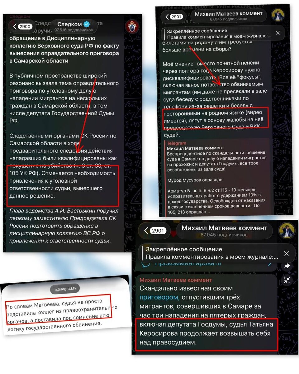 ✔️Нет, этот оправдательный приговор вышестоящий суд еще не отменил и не признал незаконным. ✔️Нет, к нему не принесли материалы ОРД о том, что есть доказательства, что, якобы, судья вынесшая его, взяла за это взятку. Об этом даже слухов никаких нет. А знаете почему он уже требует этого? Я изучил материалы СМИ и пришел к следующим выводам. ✅Изначально дело возбуждено по хулиганству за драку, в которой телесняки получил депутат Госдумы Матвеев и его водитель (последние вообще вмешались в чужую драку, хотя не являлись сотрудниками органов правопорядка). Дальше, по требованию Бастрыкина дело переквалифицировали на покушение на убийство! Что такое покушение на убийство? Это когда человек пытался убить другого, но не смог по независящим от него причинам (вовремя оказали мед. помощь, или помешали «добить» до конца). Как пишут СМИ, Матвеева мигранты ударили по голове и убежали. То есть, если бы хотели убить – добили бы (такая практика). А он остался сидеть ждать «скорую» еще 40 минут. Т.