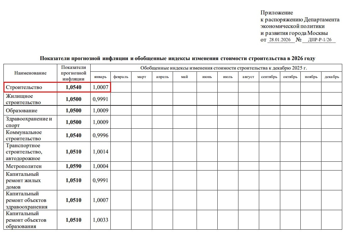 ⚡️⚡️⚡️ Распоряжение Департамента экономической политики и развития города Москвы от 28.01.2026 № ДПР-Р-1/26 «Об утверждении обобщенных индексов изменения стоимости строительства» Департамент экономической политики и развития города Москвы опубликовал Показатели прогнозной инфляции на ЯНВАРЬ 2026: ✔️ Инфляция по Строительству за январь 2026 составила 0,07% *️⃣Для применения при аналитическом сопровождении по строительству и капитальному ремонту объектов в соответствии с отчетом ГБУ "АЦ". 📱ТСН-2001 и ГРАНД-Смета