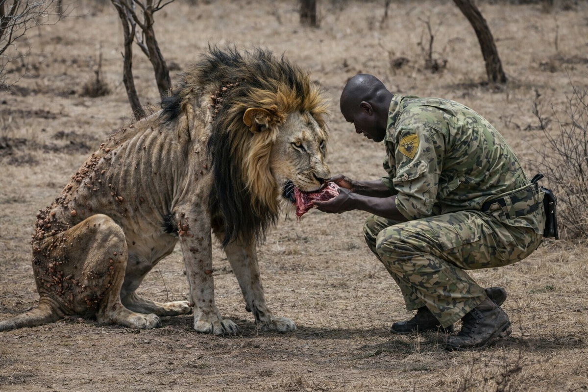 Это был живой скелет, обтянутый кожей. Грязная, свалявшаяся грива, мутные глаза, полные не злобы, а смертельной усталости. Лев шатался, готовый рухнуть в любую секунду. В этот момент рейнджер понял: он не сможет поступить по инструкции. Он сделает то, что подсказывает сердце, даже если это безумие.