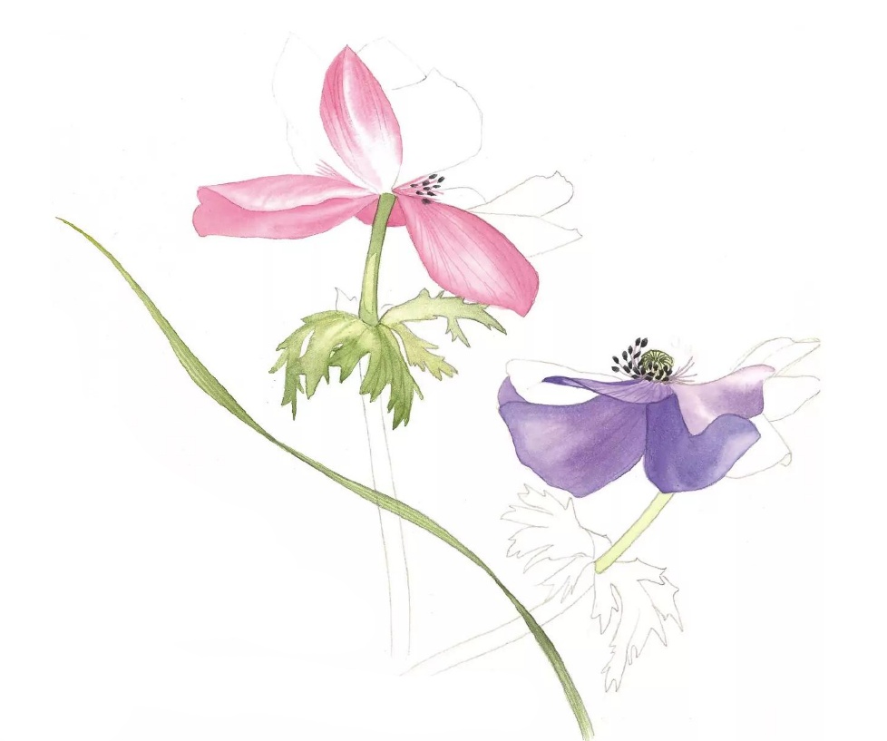 Все наши статьи по изобразительному искусству здесь. Мы часто называем эти цветы настоящими фаворитами художников. Их лаконичная, узнаваемая форма, изящные изгибы стеблей, которые тянутся к свету, и выразительные, но при этом минималистичные соцветия делают их идеальным объектом как для живописных работ, так и для графических композиций. Благодаря плавным изгибам стеблей мы можем создавать самые разнообразные и динамичные аранжировки. А их характерный мягкий розоватый оттенок с пыльным подтоном — отличная возможность попрактиковаться в тонком смешивании цветов и добавить картине живости. Центральная часть с множеством тычинок и нитей требует особой ботанической точности в передаче деталей. В данной композиции добавлено несколько травинок, мягко изогнутых вправо, чтобы подчеркнуть округлость и нежность всей картины. Концы стеблей аккуратно спрятаны за карандашной дугой, что создает ощущение глубины. Эти цветы нередко можно встретить в продаже весной — в виде срезанных букетов. Рекоменду