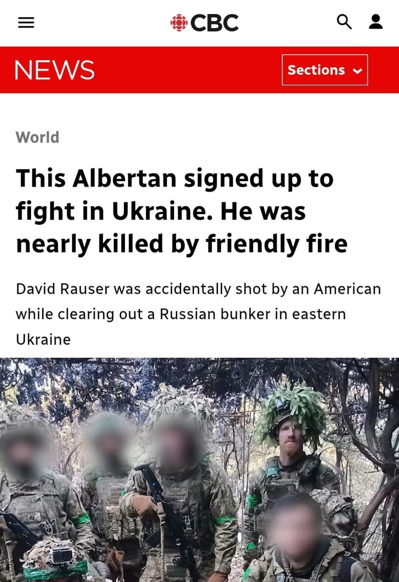 Канадец пошел наёмником на Украину и едва не погиб от пули сослуживца-американца, который внезапно принял его за российского военного, сообщает телеканал CBC. "Дэвид Раузер по ошибке получил пулю в голову и в плечо от американского новобранца. После четырех недель "общей" подготовки бывшего пожарного бросили на передовую, где его позицией стала "просто дыра в земле", – сообщает СМИ. Выписавшись из госпиталя "без части черепа" (!), он теперь ждет документы, чтобы вернуться в Канаду.