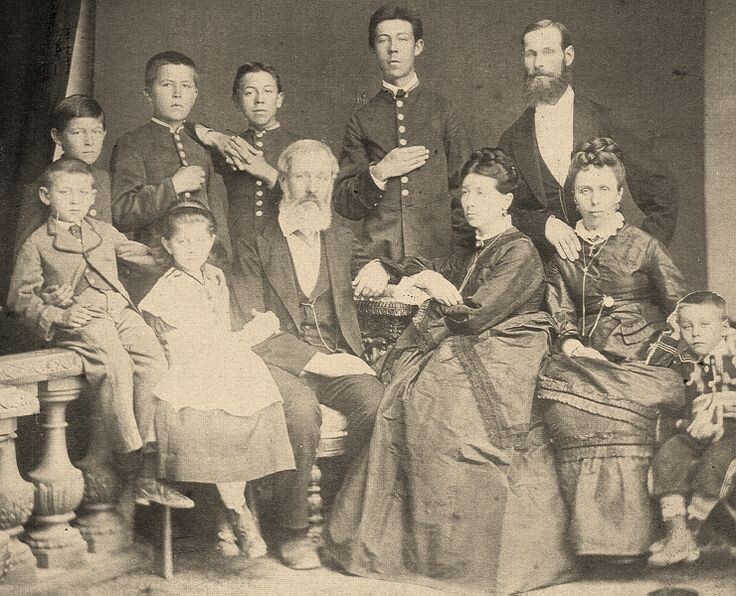 ! Будущий великий писатель родился 17 (29) января 1860 года в Таганроге в семье купца третьей гильдии Павла Егоровича Чехова и Евгении Яковлевны Чеховой (урождённой Морозовой). Третий ребёнок в семье, в которой было шестеро детей: сыновья Александр, Николай, Антон, Иван, Михаил и дочь Мария. На фото - семья Чеховых. Слева направо, стоят: Иван, Антон, Николай, Александр и М. Г. Чехов (дядя писателя); сидят: Михаил, Мария, П. Е. Чехов, Е. Я. Чехова, Л. П. Чехова (тетя писателя), Георгий Чехов (двоюродный брат писателя). Фотография С. С. Исаковича, Таганрог, 1874 г.
