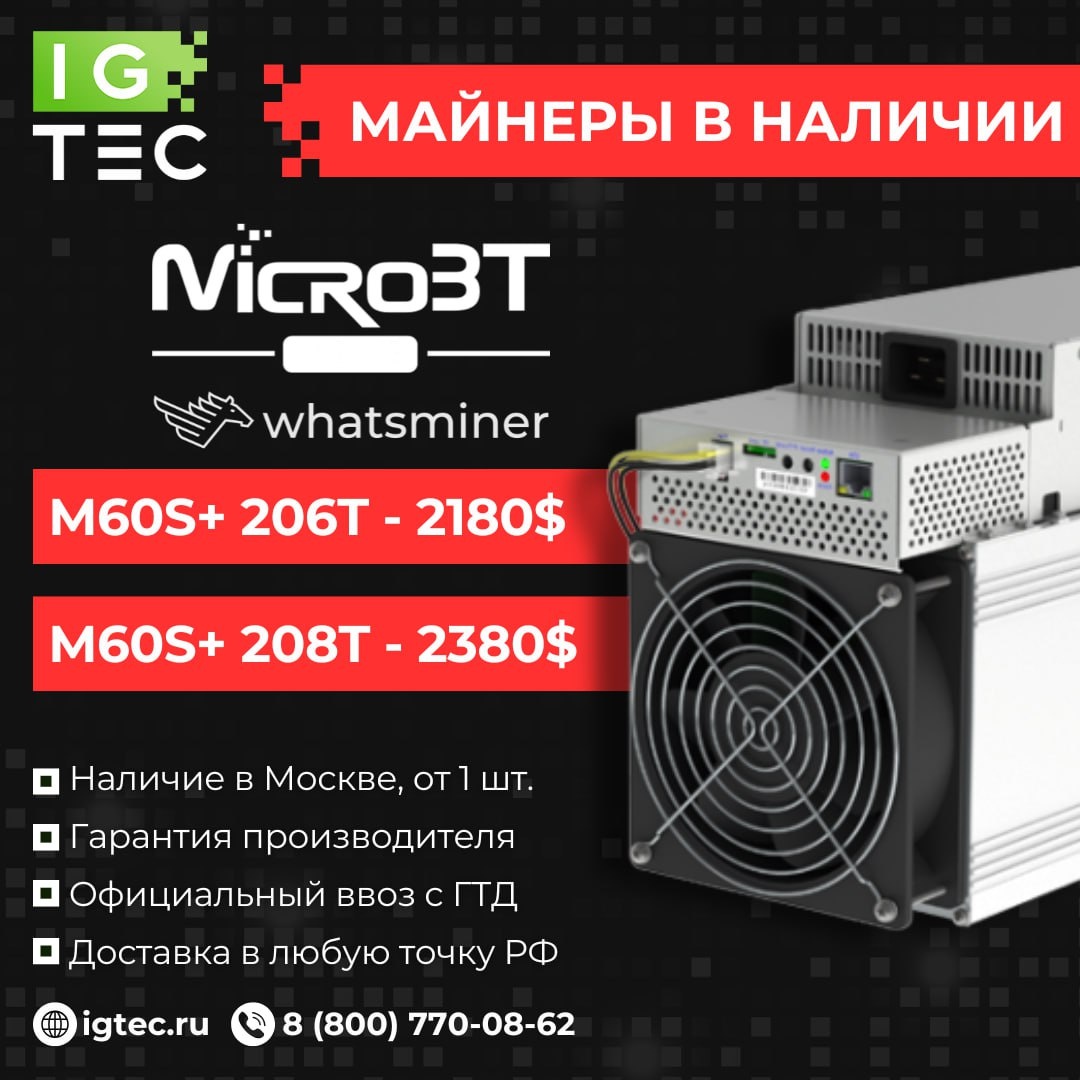 + ⚠️Майнеры доступны без долгого ожидания поставки из Китая, прямо со склада в Москве! ⚡️СПЕЦЦЕНА M60S+ 206T — 2180$⚡️ ⚡️СПЕЦЦЕНА M60S+ 208T — 2380$⚡️ 🐎Характеристики M60S+ 🔗Алгоритм: SHA-256 ⚡️Хешрейт: 206/208 Th/s 🔋Эффективность: 16,5 J/T 🔹Наличие в Москве, от 1 шт. 🔹Гарантия производителя 🔹Официальный ввоз c ГТД 🔹Доставка в любую точку РФ ❗️Количество майнеров в наличии ограничено! Для покупки обращайтесь к менеджеру: 📱 Telegram: @igtec_manager ☎️ 8(800)770-08-62 Наш сайт / FAQ-бот / О компании