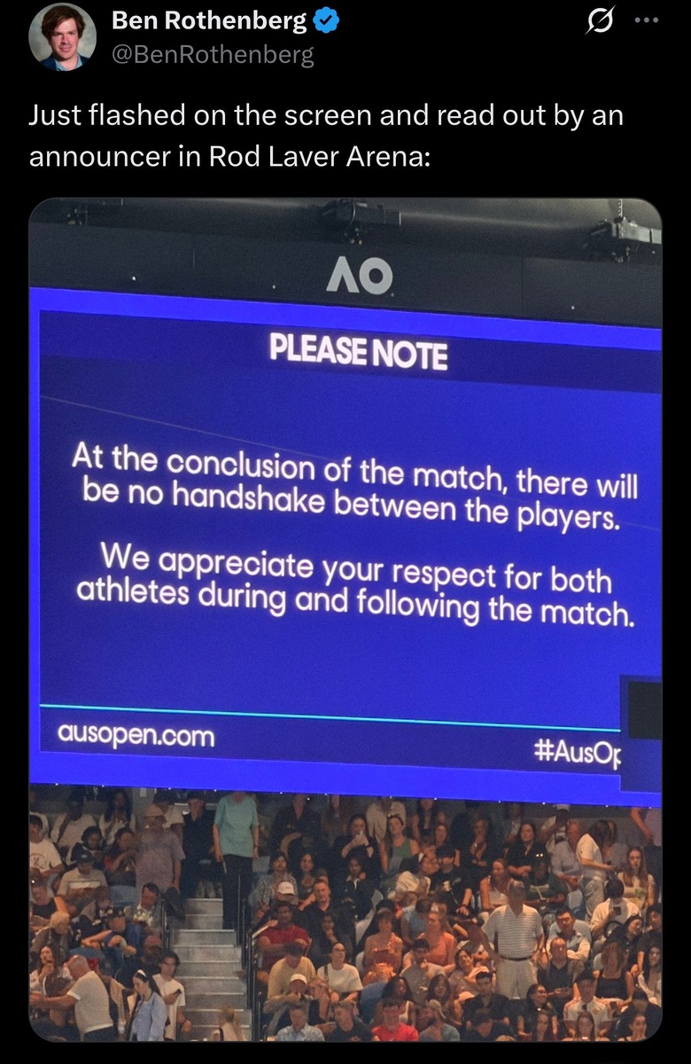 : "Пожалуйста, обратите внимание: В конце матча между игроками рукопожатие не является обязательным. Пожалуйста, проявите свое уважение к обоим спортсменам во время и после матча". Подпишись на Эйс и точка