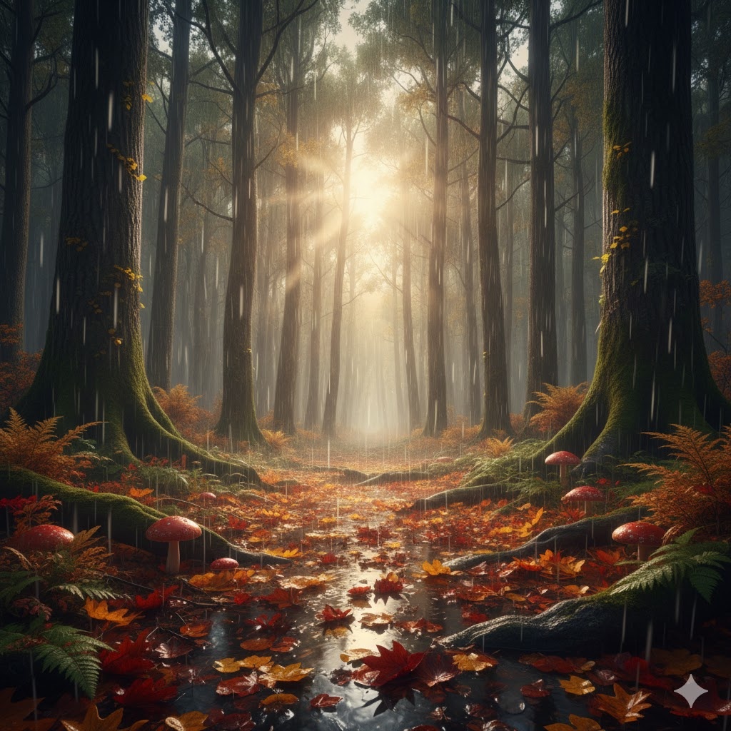 Ночью в лесу прошёл дождь. Утром всё блестело.