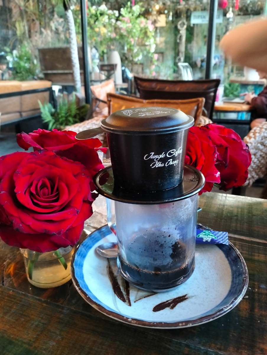 Мы заказали просто: чашку крепкого вьетнамского кофе и чашку чёрного чая. Но то, что принесли, было далеко от простоты.