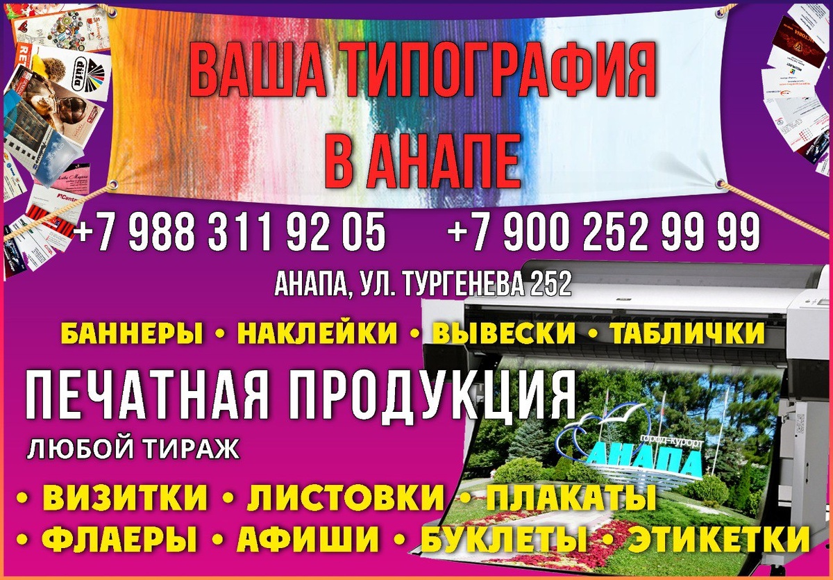 ! 🔺Баннеры, самоклеющаяся плёнка, наклейки, таблички из пластика, вывески, оформление кафе, магазинов, гостиниц...в Анапе! 🔺Визитки, флаеры, листовки, буклеты, плакаты, меню, ценники, пригласительные....в Анапе! 🔺Брендированные майки, фартуки, флаги, банданы... 🔺Дизайн! 🔺Замеры и монтаж на объекте заказчика. ❗️Скидки! 📲Обращаться по телефонам: 8-988-311-92-05, 8-900-252-99-99. #РекламаАнапа #ТипографияАнапа #ВизиткиАнапа #ФлаераАнапа #БуклетыАнапа #БаннераАнапа #НаклейкиАнапа #ВывескиАнапа #ИзготовлениеРекламыАнапа #АнапаМедиа #АнапаРеклама #ТипографияВАнапе #ИзготовлениеВывесокАнапа #ПолиграфияАнапа #ТабличкиАнапа #ПилоныАнапа #НаклейкиАнапа #БилбордыАнапа #Анапа #АнапаМедиа