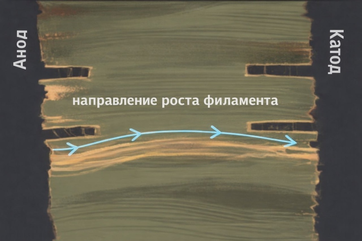 CAF часто приводит к плавающим неисправностям при работе печатной платы, и причину таких неисправностей бывает трудно распознать — не говоря о том, что сам такой дефект появляется довольно редко по сравнению с более понятными и привычными отказами. Из-за этого отношение к CAF неоднозначное: вроде бы мы знаем о его существовании, но не многие с ним сталкивались, и не многие понимают его природу. Однако CAF — это вполне однозначный электрохимический процесс, а значит он возникает и развивается при соблюдении определенных электрических и химических условий. 🟧 Упрощённо сценарий возникновения CAF выглядит так: 1. Между двумя медными элементами топологии присутствует разность потенциалов (чаще всего между переходными отверстиями или между переходным отверстием и проводником). 2. В базовом материале печатной платы появляется влага в результате диффузии и капиллярного эффекта вдоль стекловолокна. 3. В присутствии этой влаги на аноде начинается электрохимическое растворение меди. 4. Ионы меди