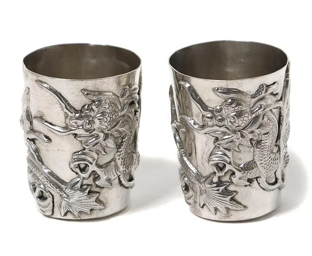 Китай, конец 19 - начало 20 века Серебро, 1890 Серебряные стопки, 2 шт, декорированные объёмным изображением драконов. Объёмный рисунок напаян на стопки. Китай, конец 19 - начало 20 века. Высота: 4,9 см, диаметр верха: 3.5 см. Объём: 30 мл. Общий вес: 66 граммов серебра не ниже 900 пробы. Стоимость лота: 58 000 ₽ Подробнее на нашем сайте