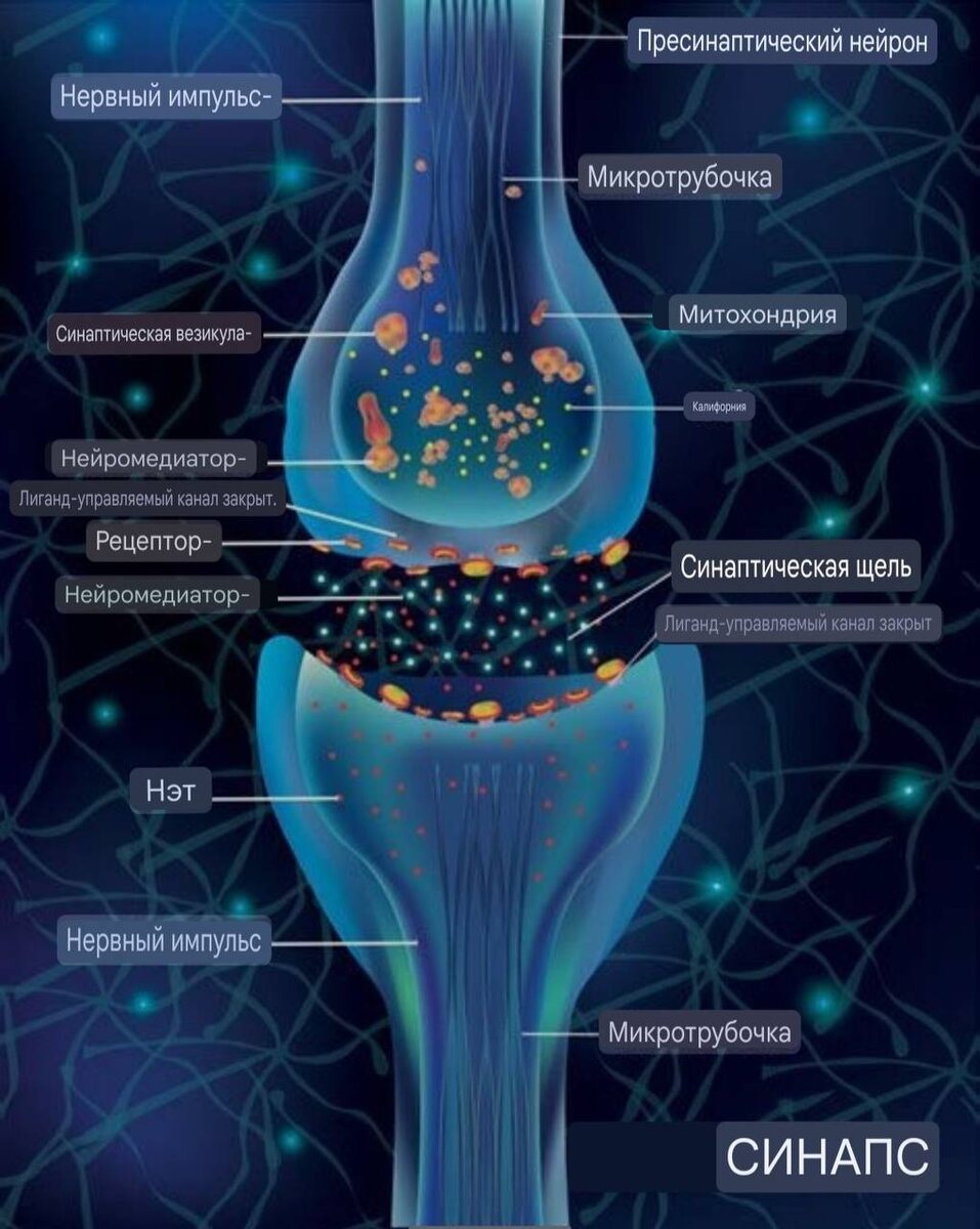 😉 📍Нейроны и нейронные сети: как мозг обменивается сигналами Мозг работает благодаря нервным клеткам — нейронам. Нейрон — это клетка, которая умеет принимать сигналы, обрабатывать их и передавать дальше. Так мозг управляет движением, чувствами, мыслями и работой органов. У каждого нейрона есть три основные части: ✅тело клетки (сома) — здесь нейрон «решает», достаточно ли сигналов, чтобы передать их дальше; ✅дендриты — короткие отростки, которые принимают сигналы от других нейронов; ✅аксон — длинный отросток, по которому сигнал уходит к следующей клетке. Нейроны не соприкасаются напрямую. Между ними есть маленький зазор — синапс ❗️ Когда сигнал доходит до конца аксона, он превращается в химическое сообщение, проходит через синапс и запускает сигнал в следующей клетке. Так информация шаг за шагом передаётся по нервной системе. Один нейрон может получать тысячи сигналов одновременно и передавать их сразу нескольким другим клеткам. Поэтому нейроны объединяются в нейронные сет