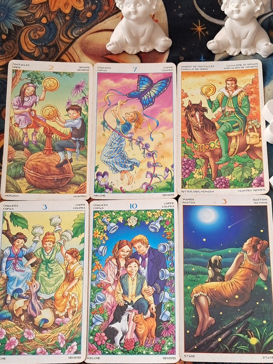 2. В сфере работы: Выбрать между соблазнительными иллюзиями (7 Кубков) и настоящим, душевным успехом в кругу "своих" (10 Кубков).