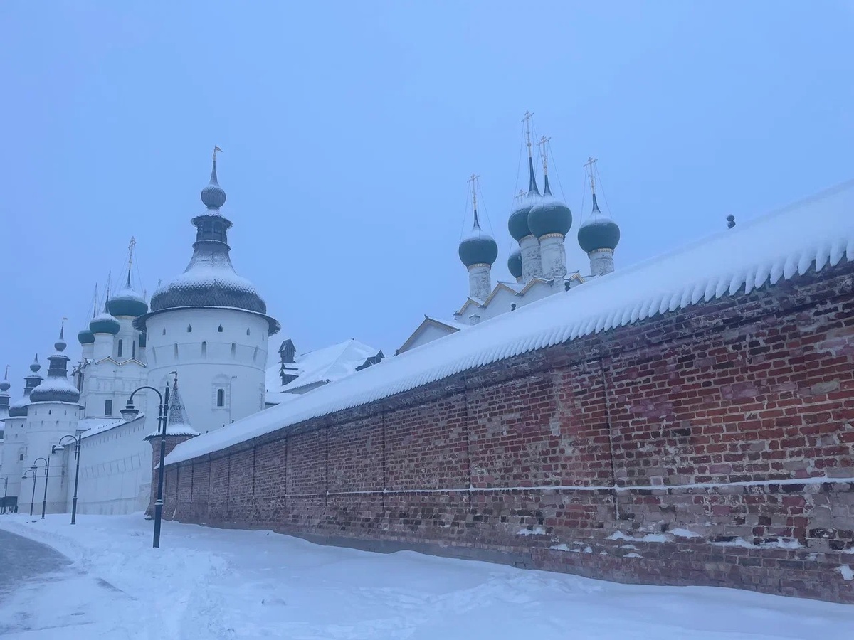 Часть 1: Часть 2: Я знал, что нас ждет еще один чудесный город – Ростов Великий! Утром мы выехали из Ярославля. Ростов встречал нас снежной погодой и узкими улочками. У моей двуногой компании были запланированы экскурсии. Моя участь была мне давно понятна – сидеть и смиренно ждать, пока они нашатаются. Чтобы я и правда смог смиренно посидеть, было решено прогуляться в окрестностях центра со мной. Красотой города мы были поражены все, даже я. Узкие старинные улочки, купола храмов, перезвоны. Я успел обнюхать вековые стены и насладиться заснеженными видами. Несмотря на то, что людей было достаточно много, было спокойно и уютно. Тихая атмосфера старинного города. Потом я отправился в машину, а мои пошли внутрь стен, бродить по музеям и смотреть на город с высоты колоколов. Время пролетело незаметно (для двуногих) и заметно для меня. Мое одиночество скрашивал крокодил с прокушенной башкой (игруха моя, если помните) и нежеваная говяжья трахея (надо беречь, вдруг оголодаю, а эти там в сугро