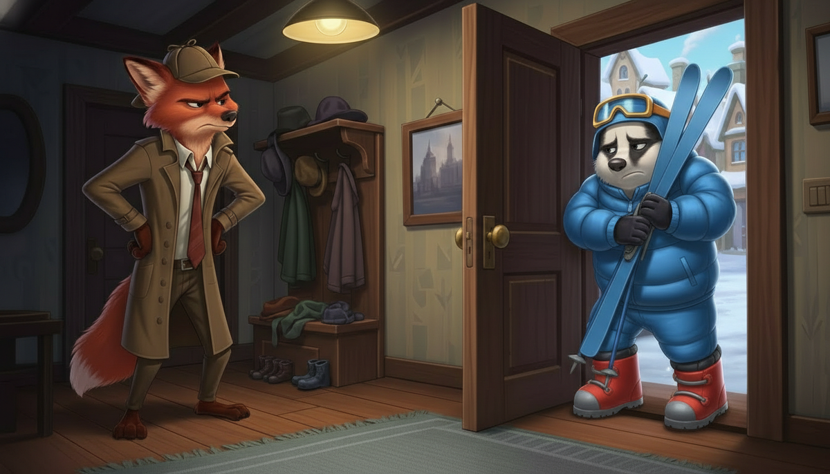 Открыв дверь, на пороге, засыпанный снегом и поникший, стоял барсук Фёдор. На нём были новенькие лыжные ботинки, а в глазах — выражение полной катастрофы.
