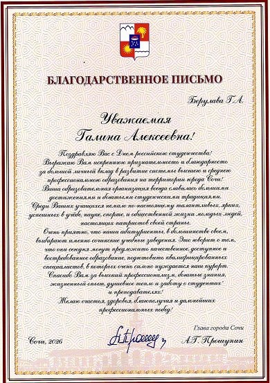 Ректор Международного инновационного университета Галина Алексеевна Берулава награждена Благодарственным письмом Главы города Сочи А. Г. Прошунина. За что присуждена награда: ✅ За большой личный вклад в развитие системы высшего и среднего профессионального образования в Сочи. Галина Алексеевна Берулава — академик РАО, доктор психологических наук, профессор, член Общественного совета при Министерстве науки и высшего образования РФ. Её многолетняя работа направлена на внедрение инновационных методик в образовательный процесс и укрепление интеллектуального потенциала нашего города. Поздравляем Галину Алексеевну с заслуженным признанием! #НовостиСочи #МИУ #ВысшееОбразование #НаукаРоссии #АдминистрацияСочи