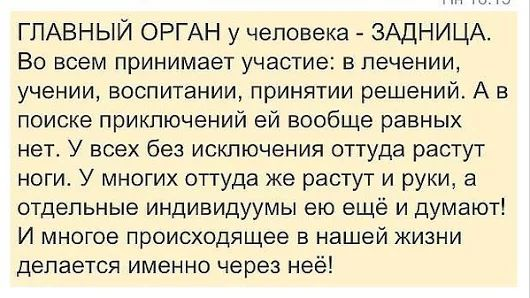 Только в России понятие Ой!па это не часть тела, а событие. А если Ой! па полная, то это целый комплекс мероприятий. ( анекдот) Пора ставить памятники этому "событию" по всему свету с большой табличкой, воспевающие все её достоинства. На этом фоне роль головы усиленно принижается. Мы когда с вами тут бурчим себе под нос на действия алгоритма, думаем, что это у нас такие программы написаны, а это не у нас, это всеобщая, единая методичка, которая учит ИИ , как ему власть над человеческим разумом взять. Взять и направить в нужное стадно-жевательное русло. Некоторые уже живут по такой программе. Называется ЭтоДругин. Ну а что. Один скажет, второй скажет, третий скажет. Сначала все повозмущаются, потом успокоятся и скажут, что всё нормально в этом мире. Хотя порой кажется, что Ей- опа выбрала довольно сложно-запутанный способ самоуспокоения. И самое главное, кто в этом виноват. Естественно, мы. И я ещё один анекдот размещу. Он не имеет никакого отношения к заданной теме. Он ни на что не на