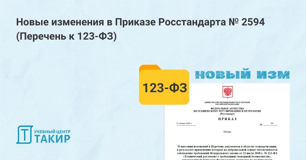 ) В конце ноября 2025 года был утвержден Приказ Росстандарта № 2594, который установил актуальный Перечень стандартов и СП, (https://t.me/takir/2417) применяемых на добровольной основе для выполнения требований Федерального закона № 123-ФЗ. 21 января 2026 года выпущен второй дополнительный Приказ Росстандарта № 90, вносящий новые правки в Перечень к 123-ФЗ. Что изменилось? 1⃣ СП 2.13130.2012 в пункте 112.5 заменен на СП 2.13130.2020 (поправили год СП) 2⃣ В пункте 124 уточнен период действия СП 485.1311500.2020 - с 01.03.2021 по 01.01.2026. 3⃣ Добавили пункт 124.1 - 485.1311500.2020 с Изм. 1 🔗 Смотреть изменения и Приказ (https://clck.ru/3RWayi) Подробнее о 123-ФЗ и Перечне стандартов и СП рассказывает Князев П. Ю. на своем авторском курсе профпереподготовки для специалистов по пожарной профилактике (https://clck.ru/3RWay2) места еще есть! 📚