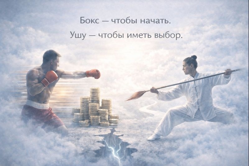 Иногда кажется, что финансовая жизнь — это просто цифры, стратегии и решения. Но если смотреть глубже, это прежде всего режим существования. Одни живут в режиме скорости, другие — в режиме длительности. И эти режимы можно условно назвать боксом и ушу. Бокс — это: В финансах это бизнес, активный доход, венчур, кредиты — ситуации, где ошибка стоит дорого, а промедление ещё дороже. Ушу — это: В финансах это инвестиции, капитал, сложный процент, снижение зависимости от дохода, умение не ускоряться под давлением. ⚡ Это не противоположности, а разные способы быть в жизни. Проблемы начинаются не тогда, когда выбирают бокс или ушу, а когда один инструмент становится единственным способом существования. 📌 Ошибка не в выборе метода — ошибка в неспособности переключаться. Иногда бокс — не выбор, а необходимость. Нет капитала, нет запаса времени — нужно действовать и создавать старт. Проблема возникает, когда человек остаётся в боксе навсегда, даже когда необходимость исчезла. Когда боксируют на