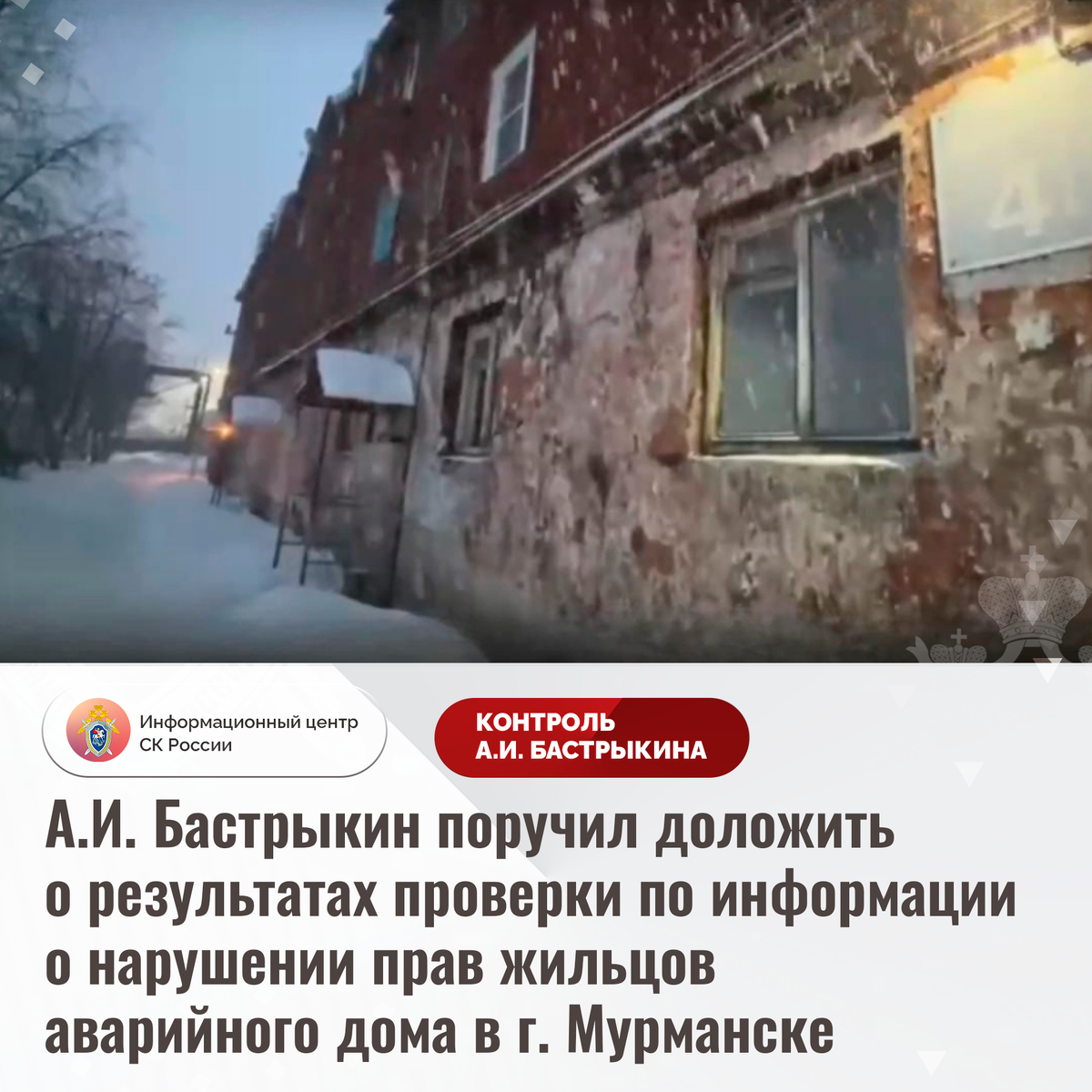 А.И. Бастрыкин поручил доложить о результатах проверки по информации о нарушении прав жильцов аварийного дома в г. Мурманске