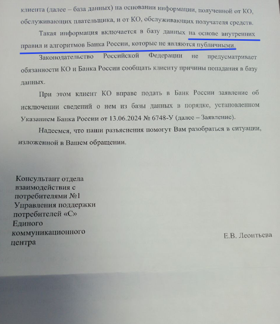 Сегодня об очередном цирке от ЦБ. Сегодня в очередной раз покажу как права людей никому не интересны. Для снятия сведений о себе из базы о случаях и попытках совершения операций без добровольного согласия клиента (так называемый "стоп-лист" Банка России по 161‑ФЗ), необходимо действовать следующим образом: 1. Что это за база? С 1 октября 2021 года банки обязаны сообщать в Банк России информацию о случаях и попытках проведения операций (переводов), на которые гражданин не давал согласие, чтобы повысить защиту клиентов от мошенников. Если ваш паспорт или личные данные были использованы мошенниками, ваш профиль может попасть в специальный перечень (стоп‑лист), и операции по вашим счетам могут блокироваться. Плохо то, что что Ваши данные могут попасть туда и просто так :) . ДА! Просто так. И Вам просто заблокируют все счета и карты вместе с деньгами. --- 2. Основания для включения и исключения В соответствии с частью 5 статьи 5.7-1 Федерального закона № 161-ФЗ "О национальной платежной сис