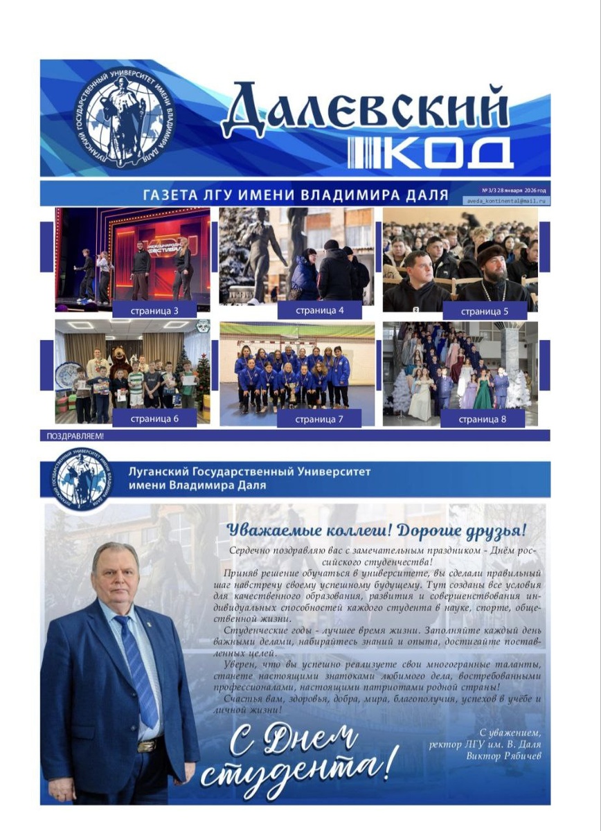 ! ✌ 🔔 Дорогие друзья и уважаемая молодёжка! ✔️ Третий выпуск общеуниверситетской студенческой газеты Далевский код уже доступен для прочтения! ➡️ В этом номере вы увидите: 🔵 Поздравления с Днём российского студенчества от уважаемого ректора нашего университета; 🔵 Спортивные достижения наших студентов; 🔵 Волшебный студенческий казачий бал. Об этих и других интересных событиях читайте ниже в нашей газете ⬇️ #Делаю #ТвойХод #Росмолодежь