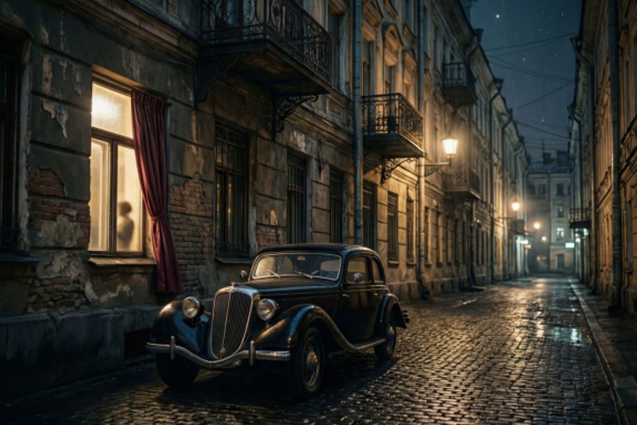Один из вошедших, тот, что был ближе, сделал лёгкий, почти небрежный жест рукой. В слабом свете ночника блеснуло лезвие. Это не был нож мясника или бандита — длинный, узкий, отточенный инструмент, холодный и безликий, как сама эпоха.