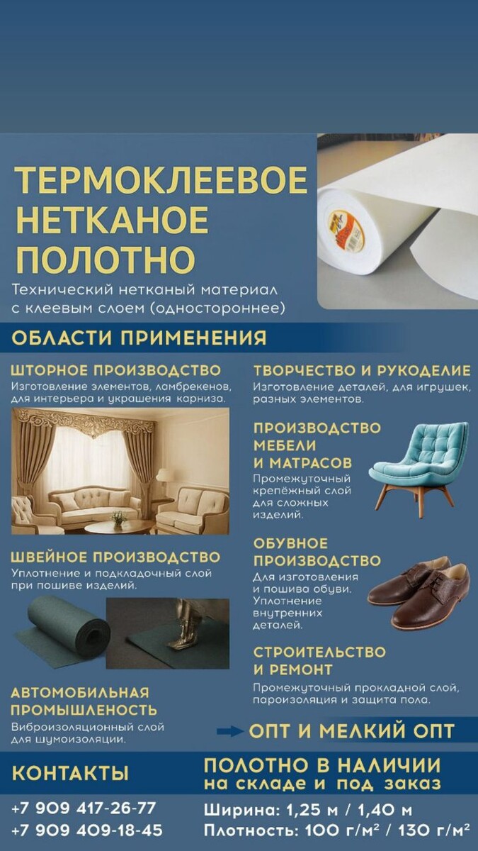 ! Сообщаем о поступлении на склад термоклеевого бандо. ❗️ В наличии следующие артикулы: ⭐️ Бандо № 2, (1,25м) ⭐️ Бандо № 3, (1,45м) ⭐️ Бандо № 4, (1,45м) ⭐️ Бандо № 7, (1,21м) ⭐️ Бандо № 8, (1,25м) Что такое термоклеевое бандо? Это плотный нетканый материал с односторонним клеевым покрытием, разной плотности, разной ширины. 🟣 Основное назначение ❗️служить основой для ламбрекенов ❗️Швейное и обувное производство ❗️Производство мебели и матрасов - как промежуточный крепежный слой для сложных изделий ❗️Строительство и ремонт - промежуточный прокладочный материал ❗️Обувное производство - для изготовления и пошива обуви ❗️Автомобильное производство - виброизоляционный слой, для шумоизоляции Ключевые преимущества нашего бандо: ⭐️ оптимальная гибкость (разработана с учётом рекомендаций технологов швейных производств); ⭐️ высокое качество (продукт создан на основе 20‑летнего опыта работы с клиентами). Варианты покупки: 🟣 оптом; 🟣 рулоном; 🟣 на отрез. Свяжитесь с нами: те