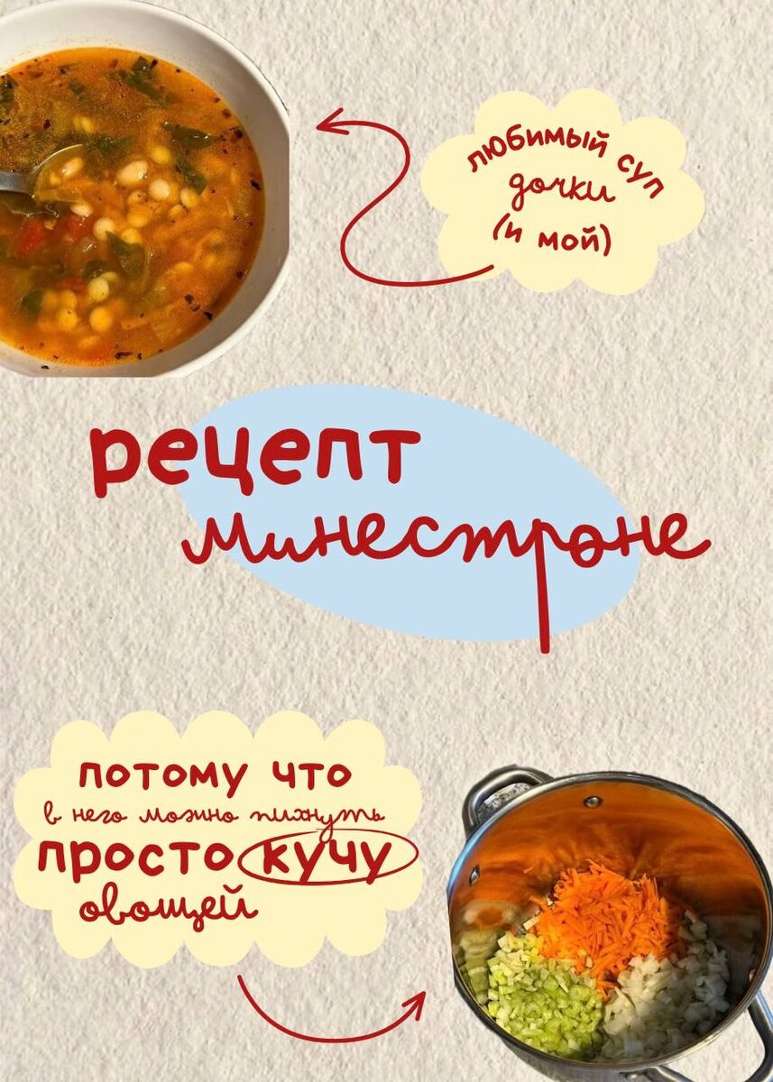 😁 Давно у нас не было супов, сейчас у Сони в топе минестроне🤌 Хочу поделиться, потому что раньше, когда я его готовила, занята была каждая емкость в доме под овощи, которые надо добавлять в разное время и т.д и т.п Но стоило убрать один из углеводов - картошку (а зачем он нам, там же уже есть паста😎) и процесс стал сильно проще и быстрее 🌟граммовки не пишу, так как все зависит от того, какого объема ваша кастрюля Итак, ингредиенты: ⚪️Куриный бульон ⚪️Морковь ⚪️Лук ⚪️Сельдерей ⚪️Томатная паста ⚪️Помидоры ⚪️Фасоль ⚪️Шпинат ⚪️Брокколи/цветная капуста ⚪️Укроп/петрушка/кинза на ваш вкус ⚪️Орегано/базилик/лавровый лист ⚪️Любимая паста (здесь птитим, но можно любую, хочу попробовать детскую фигурную) ⚪️Сыр для подачи Приготовление: 🌟 В кастрюле пассируем морковку, лук и сельдерей на оливковом масле до золотистого цвета 🌟 Добавляем томатную пасту (маленькой упаковки 70 г вполне достаточно), обжариваем еще немного 🌟 Добавляем помидоры и фасоль. Первые сначала надо очистить от кожуры.