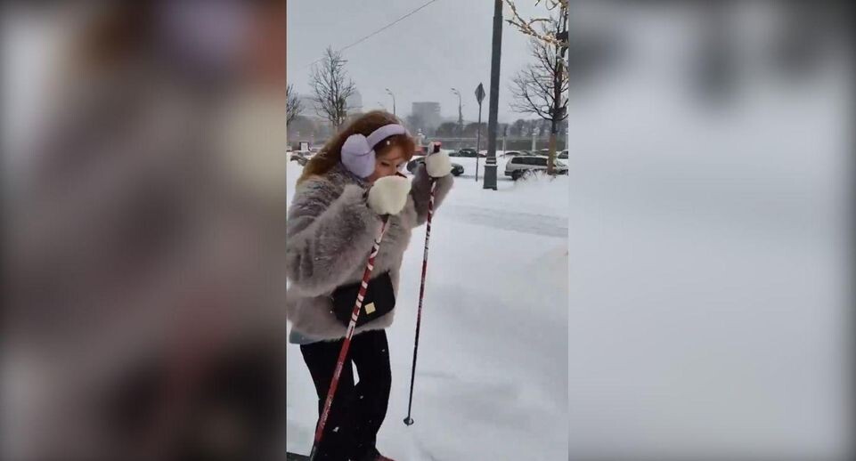 Летит на работу без пробок: женщину на лыжах сняли на видео в центре Москвы