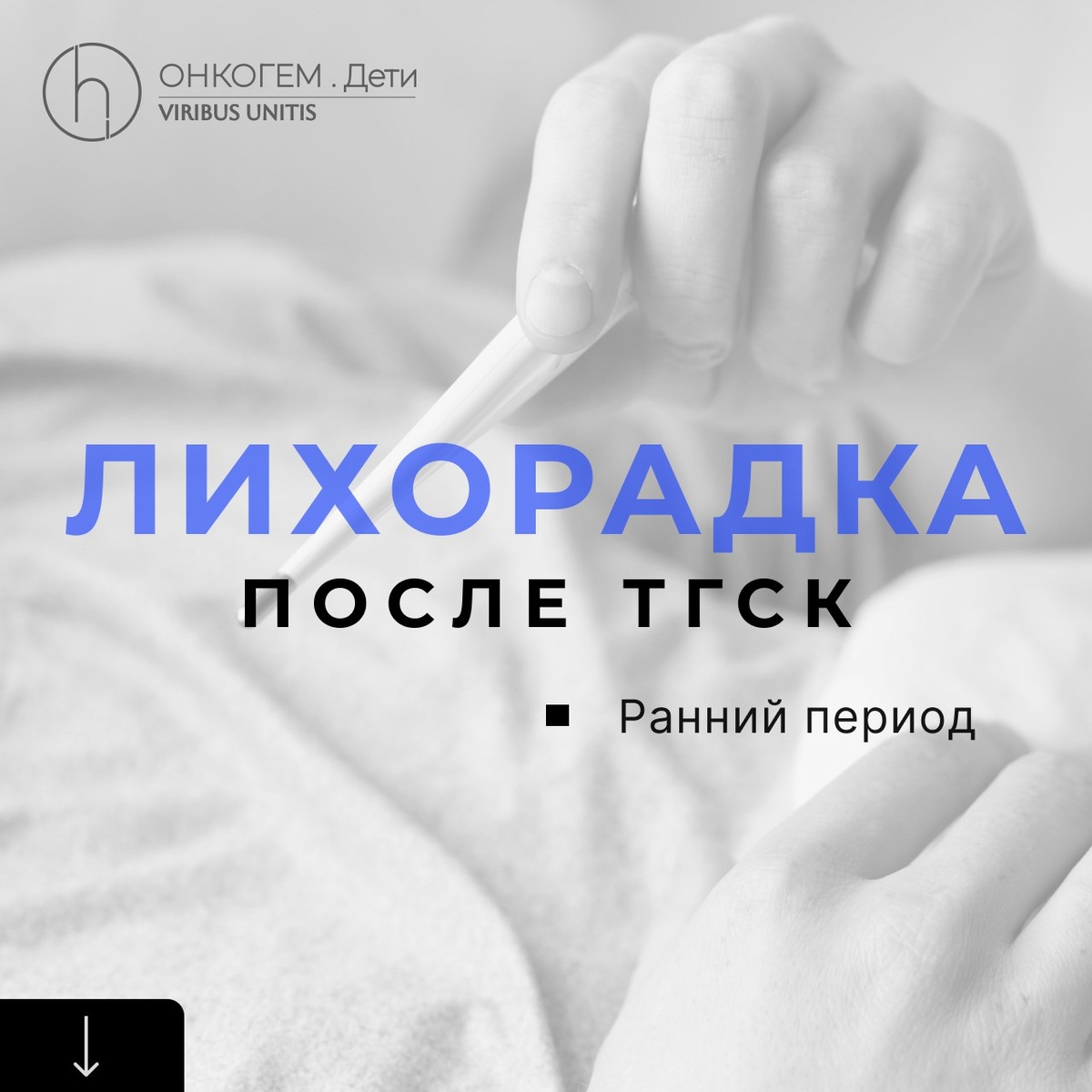 Повышение температуры после ТГСК до 38 °C и выше — повод насторожиться. Даже незначительное повышение может сигнализировать о неблагополучии в организме. КАК МЕНЯЕТСЯ РИСК ЛИХОРАДКИ ПО СРОКАМ ПОСЛЕ ТГСК Вероятные причины лихорадки зависят от иммунной реконституции (процесс «перезагрузки» и восстановления иммунной системы). Условно весь период восстановления иммунитета после трансплантации можно разделить на 3 периода: 1️⃣ Ранний период (первые 30 дней) характеризуется отсутствием нейтрофилов и знаменуется их восстановлением. Организм крайне уязвимый. В это время лихорадка чаще всего связана с инфекциями — бактериальными, вирусными или грибковыми, — или с "цитокиновым штормом". 2️⃣ Период ранней реконституции (30–100 дней) - появляются первые иммунные клетки адаптивного иммунитета - Т- и В-лимфоциты. Риск инфекций сохраняется, но появляется ещё одна серьёзная причина — реакция «трансплантат против хозяина» (РТПХ). Это состояние, когда донорские клетки начинают воспринимать ткани