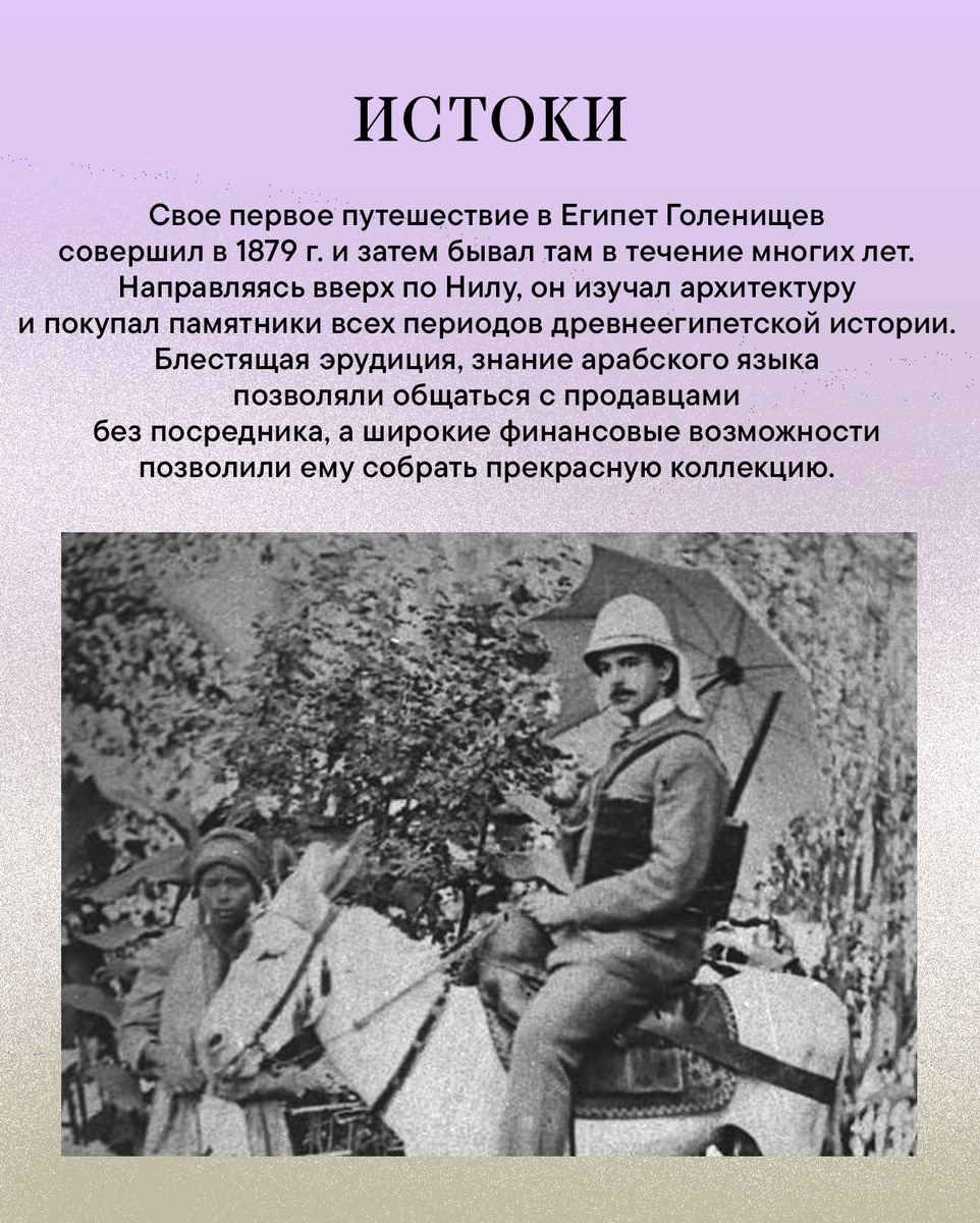 29 января 1856 года родился Владимир Семёнович Голенищев — первый русский профессиональный египтолог и востоковед. В течение тридцати лет он собирал ценнейшую коллекцию египетских и переднеазиатских древностей — чуть больше 6 тысяч предметов. Бесценная коллекция Голенищева легла в основу египетского собрания ГМИИ им. А.С. Пушкина. В день его 170-летия рассказываем вам о том, почему его значение во всемирной египтологии нельзя переоценить. Увидеть предметы из коллекции Голенищева можно в Главном здании музея (Волхонка, 12).