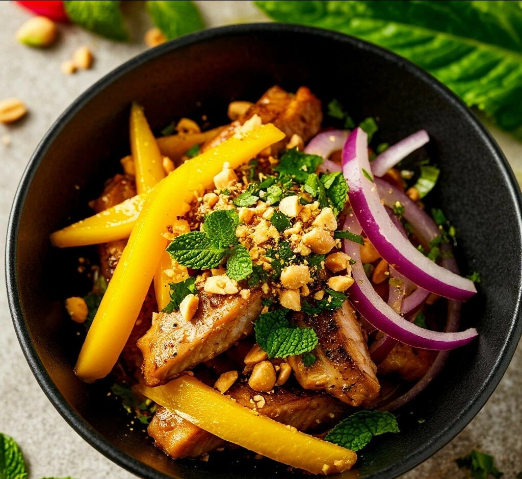 Мяу! Если хочется ярких эмоций и взрыва вкуса — этот салат для вас! Сладкое манго, копчёная рыба, острый перец и кисло-солёная заправка — классическое тайское сочетание, которое бодрит лучше любого кофе! 🌶️