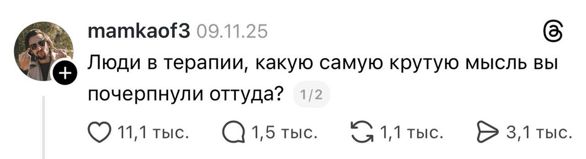 Их инсайты после терапии. 💔Тревога не подстрахует от бед и печалей, но украдет счастье сегодняшнего дня 💔Нет хороших или плохих эмоций, каждая эмоция- это про наше состояние 💔Мир не настроен против тебя 💔Тревога- не равно реальность. 💔Не имеет значения, что думают о тебе другие люди. От этого ты не становишься хуже. 💔Секрет проработки детских травм- стать взрослым своему внутреннему ребенку, которого тебе не хватало в детстве 💔Самый главный и любимый человек в твоей жизни- это ТЫ 💔Контроля не существует, это иллюзия. 💔В злости нет ничего плохого 💔Не обязательно быть отличницей, можно жить на "четверочку" и даже на "троечку" 💔Если перестать терпеть говно, то говна в твоей жизни будет меньше 💔Абсолютно неважно, почему человек поступил со мной плохо. Надо уходить просто потому, что плохо стало мне, а своей терапией пусть он займется сам. 💔Я не могу контролировать других людей и события. Но я могу контролировать, как я на это реагирую 💔Куда я направляю свое внимание, того и