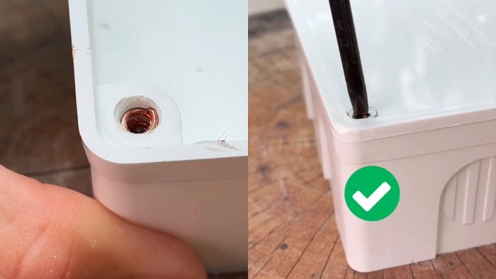 Резьба в пластиковых корпусах не отличается высокой надежностью. При частых сборках и разборках она может легко сорваться. Согласитесь, проблема крайне распространенная. И вот вам отличное решение, как в два счета восстановить резьбу, тем что есть под рукой. Чем больше отверстие, тем проще будет его восстановить. Первым делом необходимо найти одножильный медный провод, таким диаметром, чтобы он входил в резьбовые канавки самореза (винта). Далее нужно накрутить проволоку по резьбе самореза. При помощи кусачек обрезать лишнее. Держа саморез с проволокой за шляпку кусачками, нагреваем его зажигалкой. И устанавливаем в сорванное отверстие. Немного подождём пока пластик остынет. И можно вывернуть саморез. Отверстие восстановлено и готово к использованию. Благодаря такой медной вставке данное отверстие прослужит гораздо больше и с легкостью будет выдерживать последующие разборки и сборки.